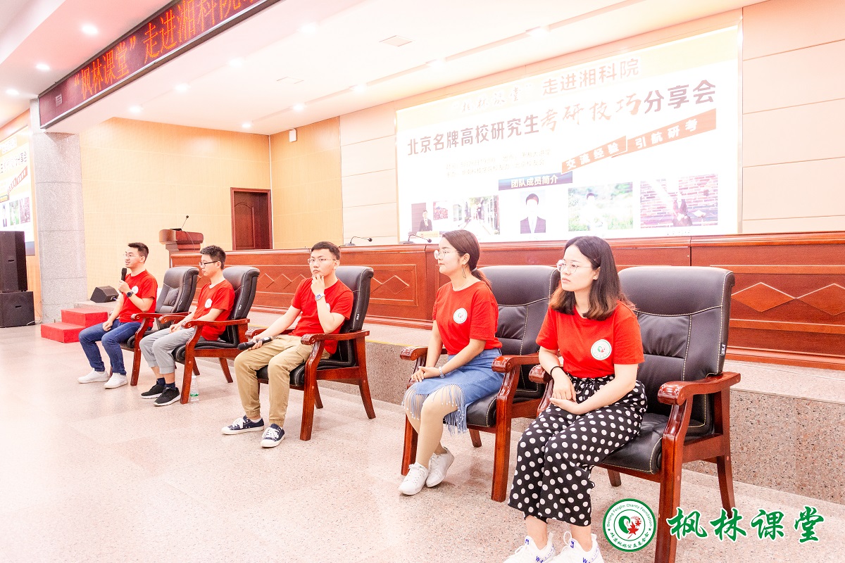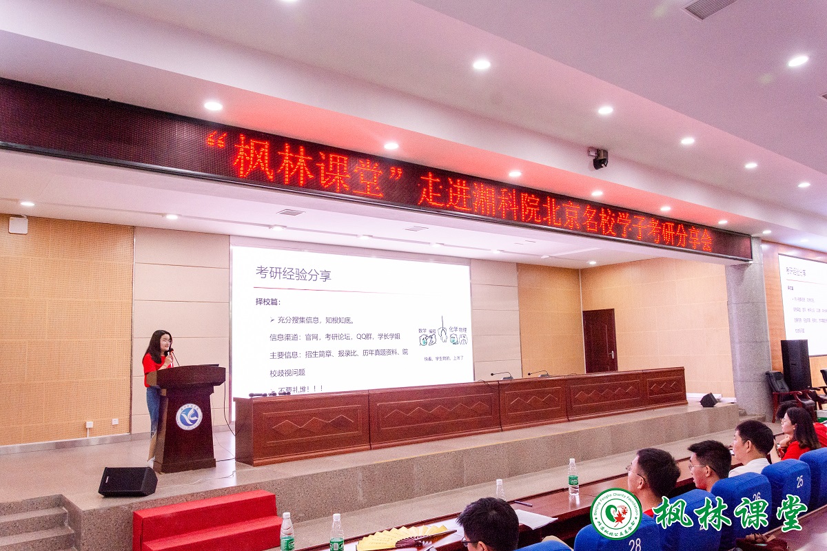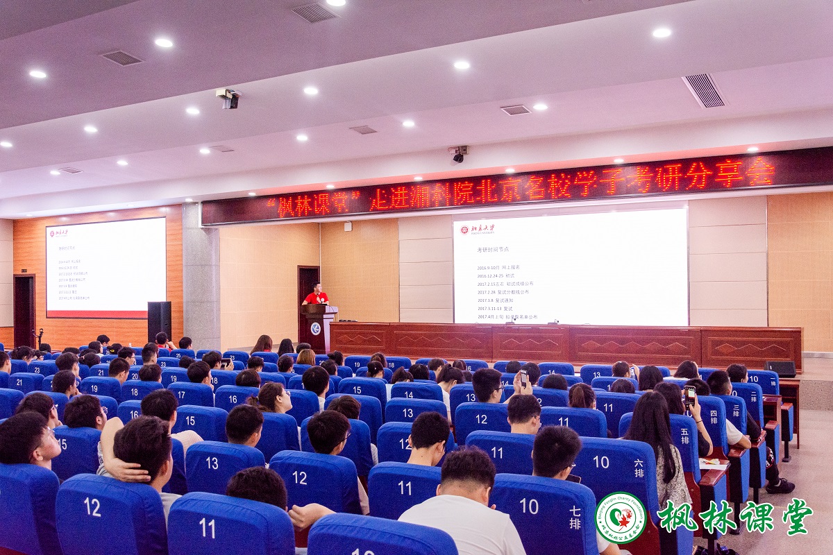 5月26日晚,由bat365官网校友办联合北京校友会所属枫林公益基金会主办的“枫林课堂走进湘科院:北京知名高校研究生考研技巧分享会在学校潇湘大讲堂盛大举行,校友办主任杨能山出席了本次活动,来自学校15个教学学院的600多名学生兴致勃勃地参加了分享。