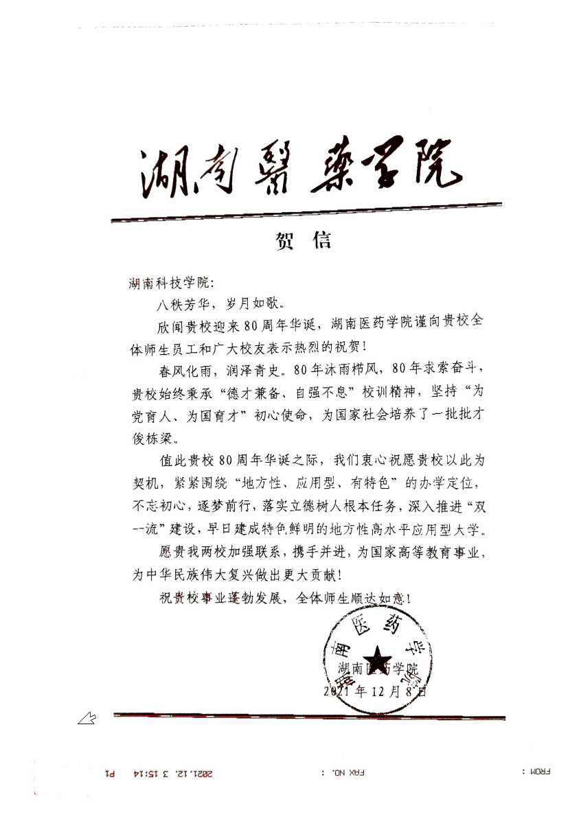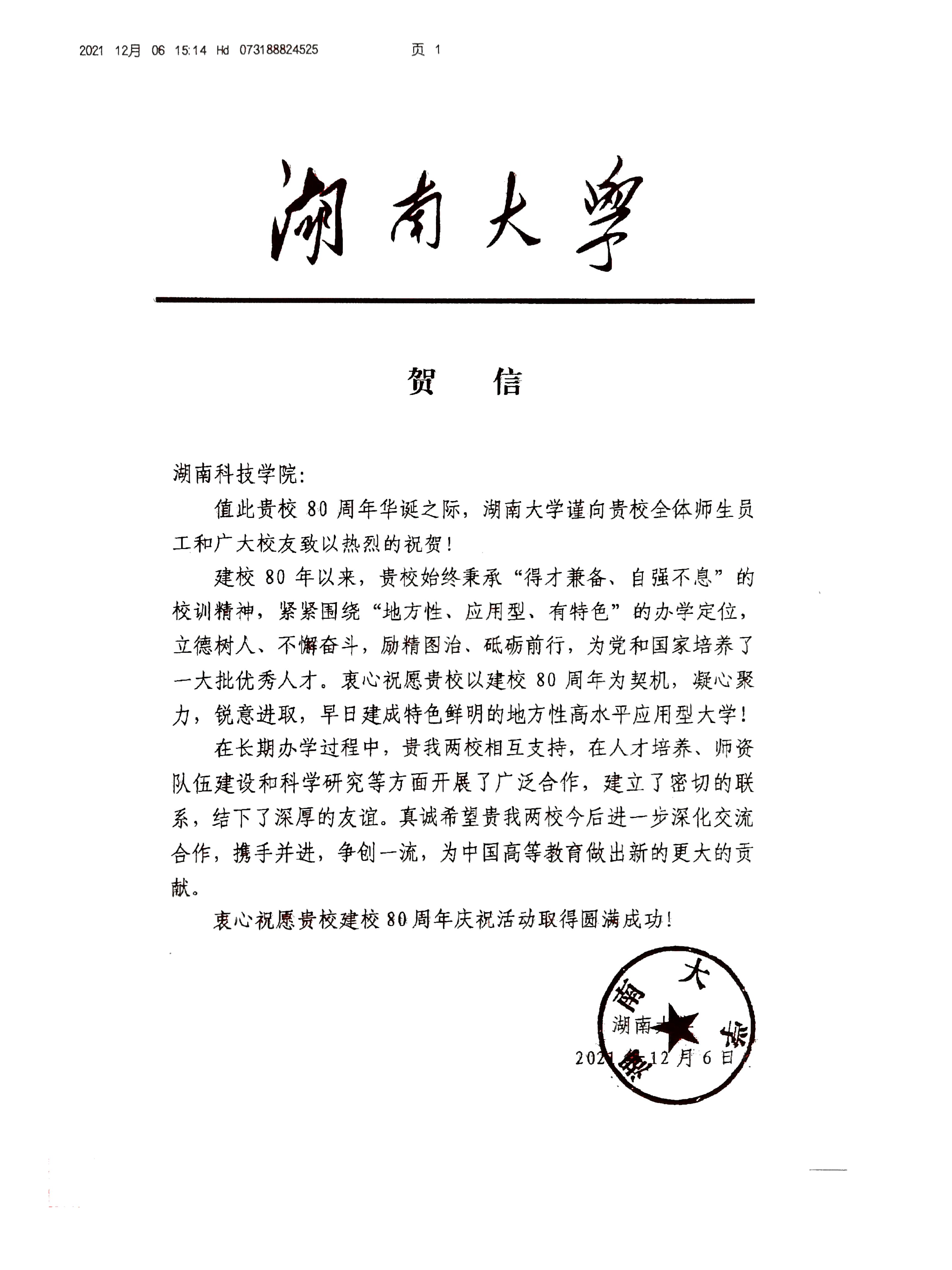 20211206给bat365中文官方网站校庆的贺信(湖南科技大学)