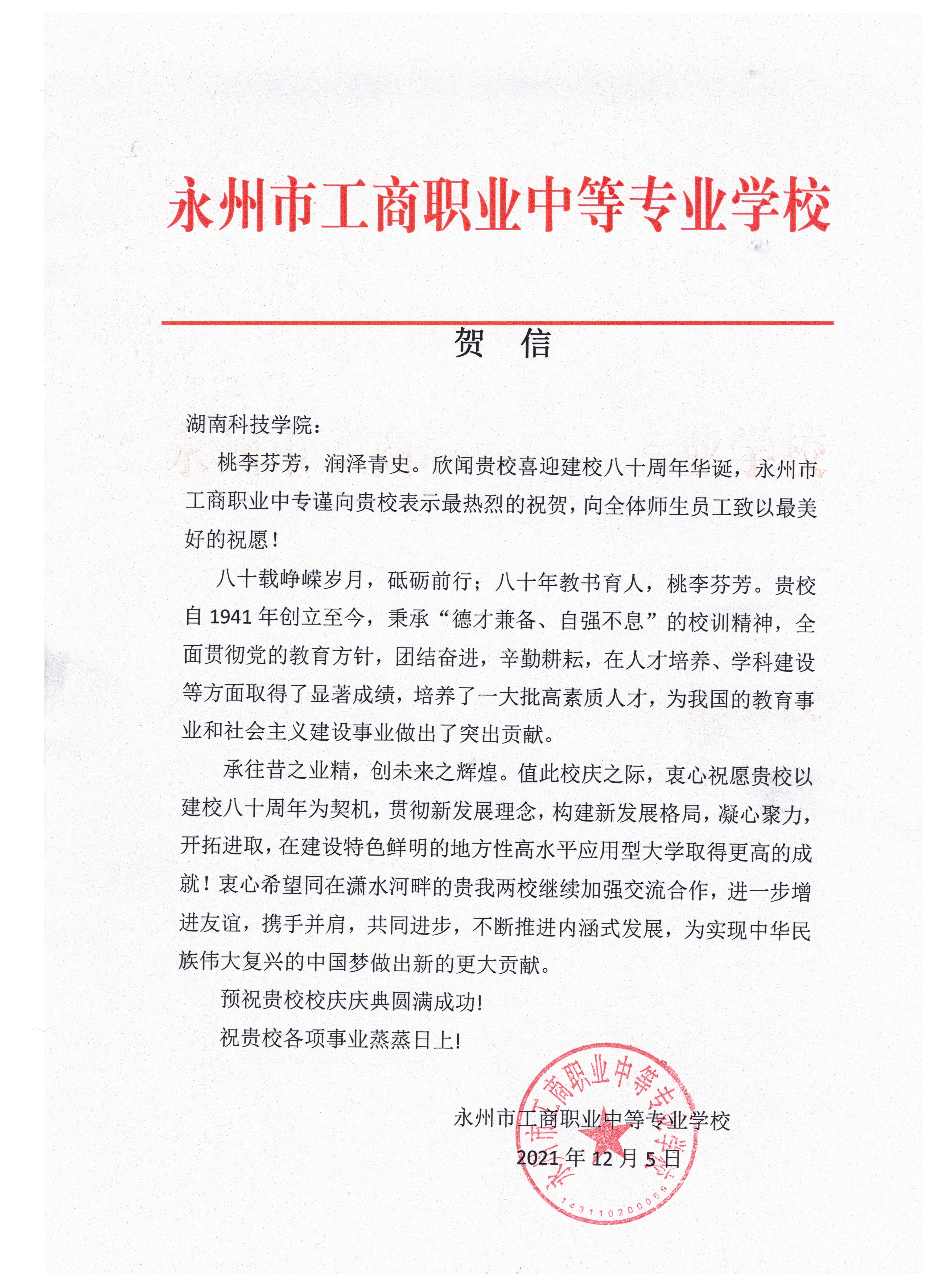 20211206给bat365中文官方网站校庆的贺信(永州工商职业中专学校)