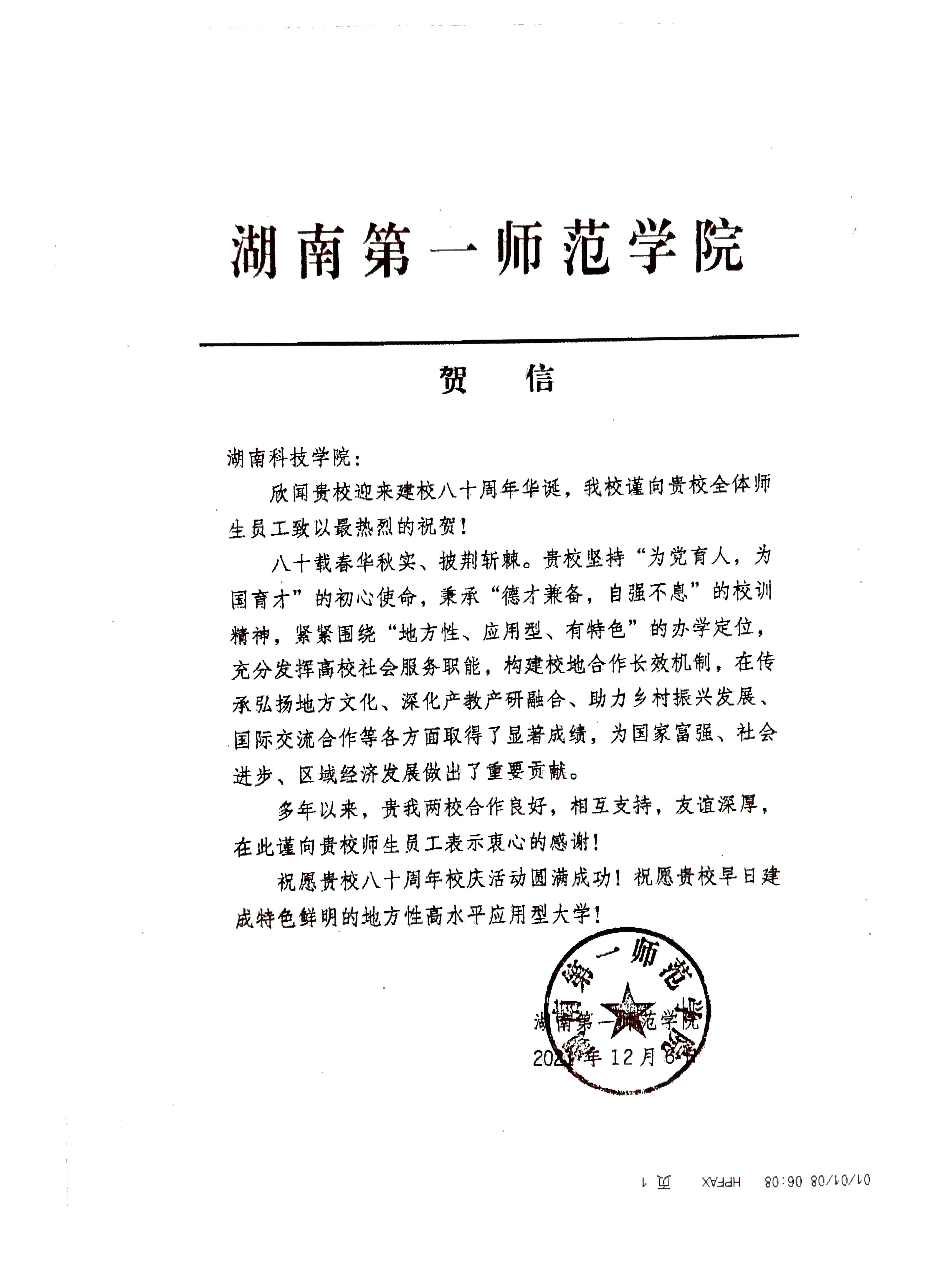 20211206给bat365中文官方网站校庆的贺信(湖南第一师范学院)
