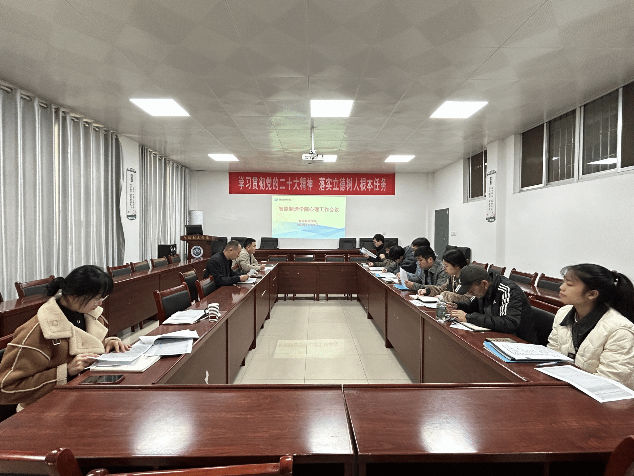 本网讯(通讯员 陈慧玲)11月21日下午,学院在致远楼103会议室召开心理健康教育专题工作会议,学院党总支副书记彭涛凯,全体辅导员,2024级各班班主任参加会议。