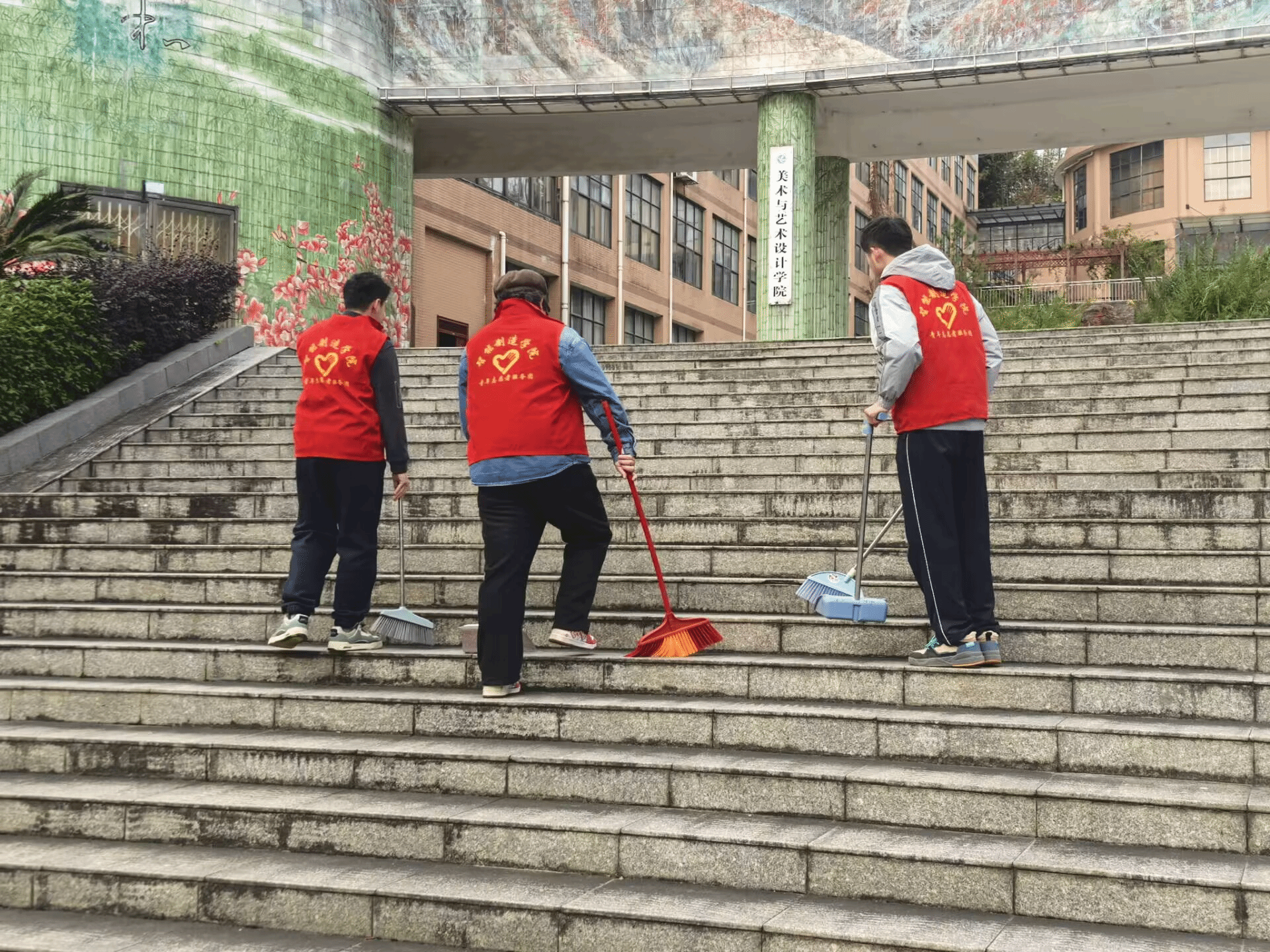 同学们身着统一的志愿者服装,对校园主干道进行了彻底的清扫。经过一个多小时的辛勤劳动,校园主干道焕然一新。