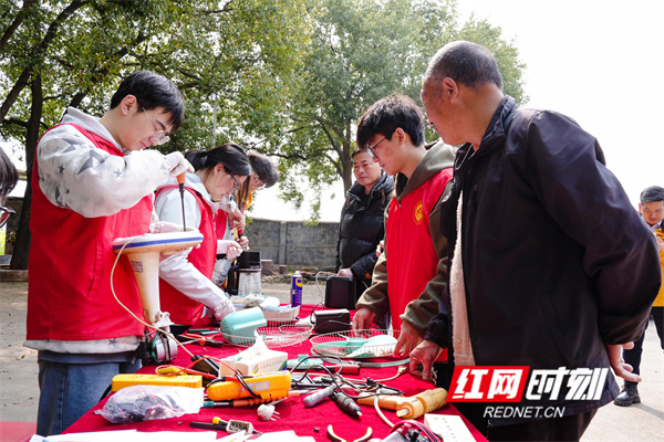 在伍家寨村文化广场上,志愿服务同样热闹。村民们拎着电风扇、电饭煲等故障家电纷至沓来,该院智能科学与技术协会的10余名师生志愿者们分工协作、拆机检测、焊接调试,动作娴熟。村民伍继恩的电风扇转不动,志愿者5分钟便排查出电容问题并修好,还手把手教他日常保养技巧。“这是儿子送的,扔了可惜,孩子们修得好还想得细,太贴心了!”伍继恩捧着修好的电风扇,笑得合不拢嘴。