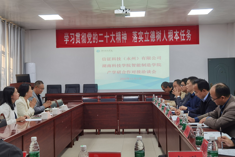 本网讯(通讯员 康平)为持续深入推进校企产学研合作,开拓毕业生实习就业岗位。应我院邀请,11月1日下午,信征科技(永州)有限公司总经理曾棱一行专程到我院开展产学研合作洽谈。学院班子成员、教授、博士代表、系主任、辅导员参加洽谈会。这是10月26日我院赴永州市经开区开展“学习贯彻党的二十大精神·博士教授入企专项调研”的有效对接和延伸。