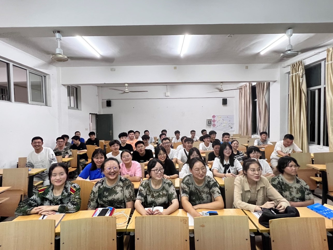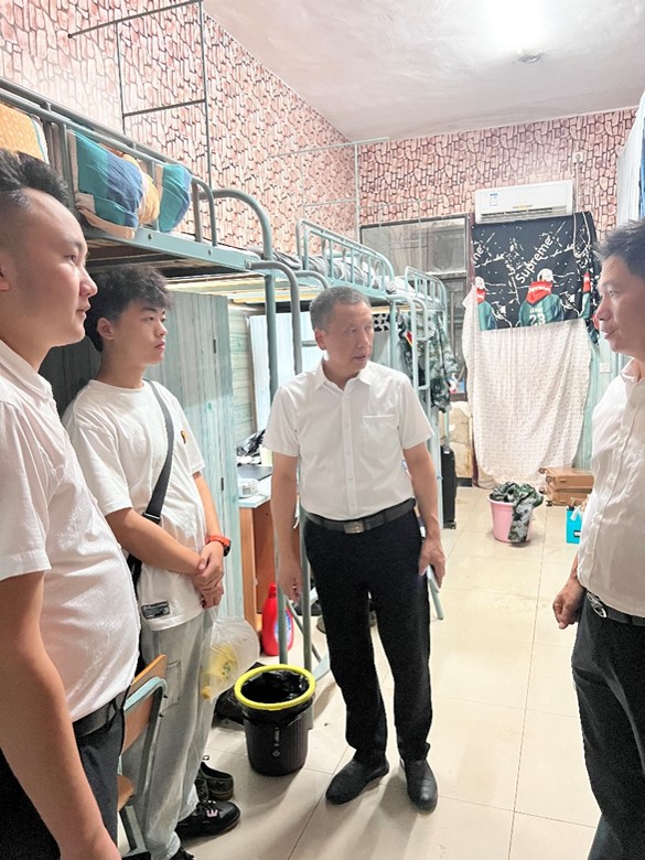 学院院长魏大宽、党总支书记谭永宏、学工办主任康平在同学们结束了一整天的军训后,去寝室亲切的关怀学生大学适应情况。