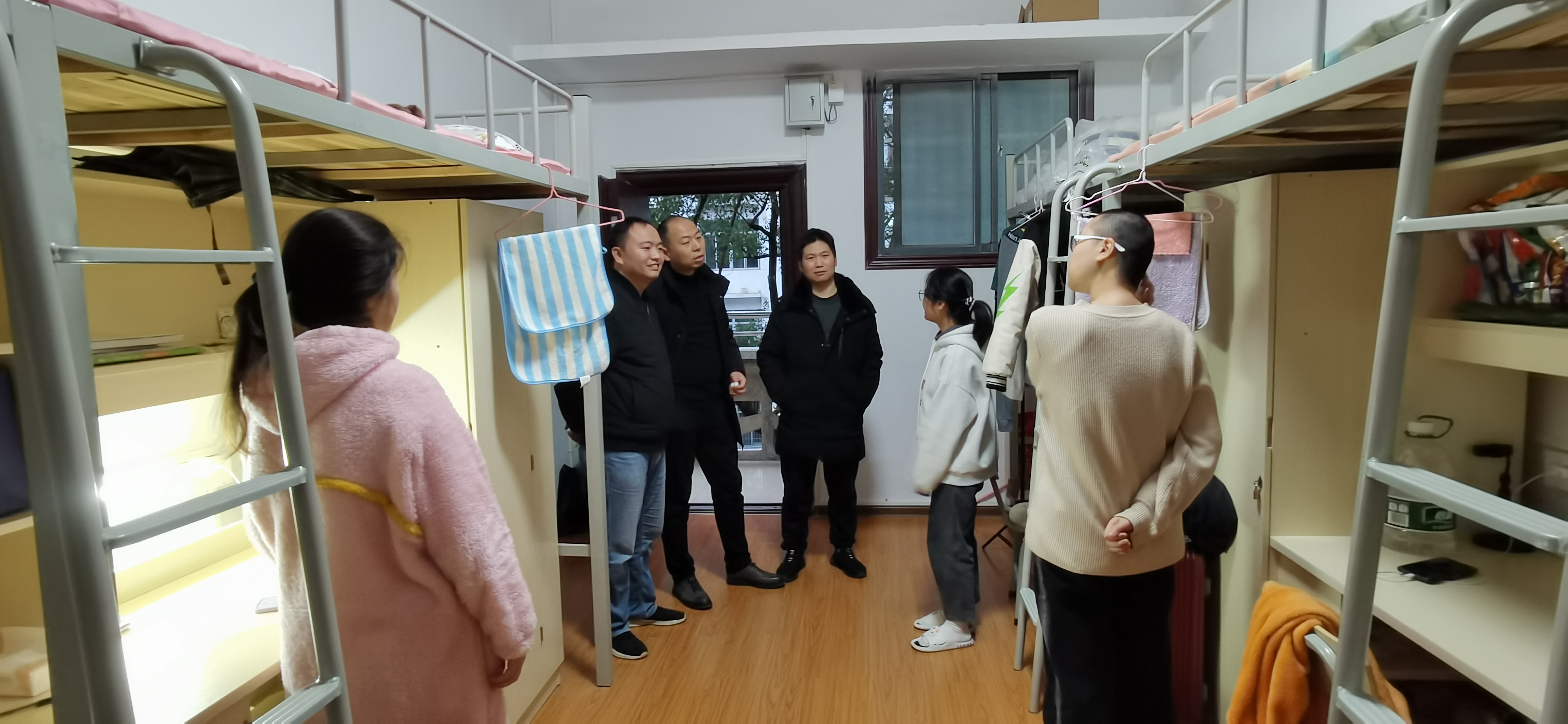 在留校学生集中住宿宿舍,谭永宏等人仔细询问了同学家乡目前的疫情情况,以及留校以来的学习、住宿、饮食等情况。谭永宏表示,因疫情无法回家而留校与同学、老师一起过年,将会是人生一段难忘的美好回忆,希望留下来后能够安心学习,利用假期为自己“充电”,静下心来阅读一些好的书籍,为将来的目标好好做规划。彭涛凯嘱咐曹津瑶同学要注意劳逸结合,按时作息,经常性的与家人和老师保持联系,积极开展健身运动,强健体魄,配合学校做好疫情防控工作,增强自我防护意识,养成良好的习惯,并盛情邀请曹津瑶同学大年三十到家里与家人一起吃年夜饭。
