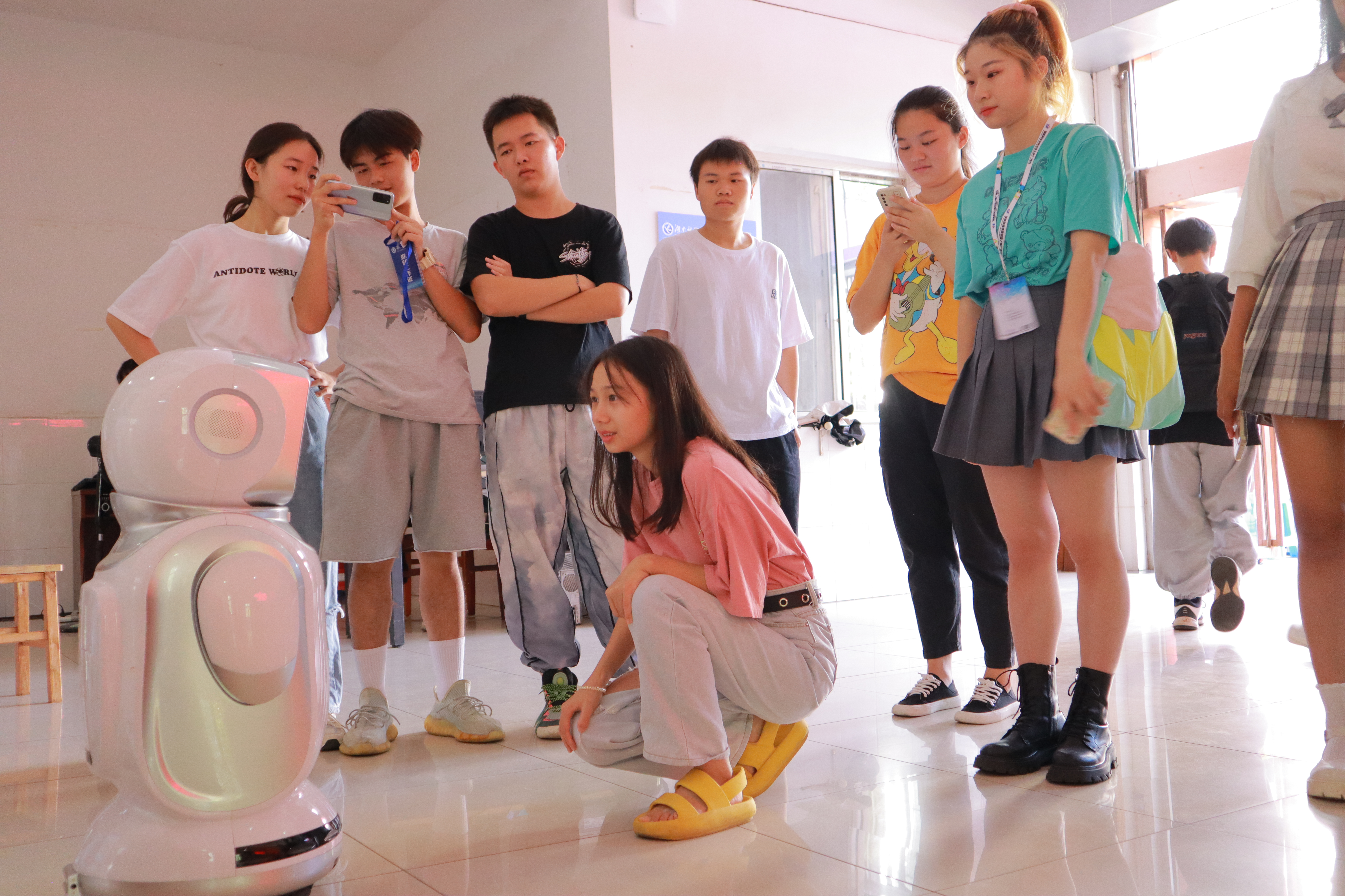 “她额头的多个摄像头具备拍照、录像、红外线检测、避障与闪光灯等功能,手部、头顶装置有传感器,一旦有人触摸,传感器就会传递信息,发起语音互动,背部有超声波避障功能,能敏锐地检测到障碍物并避开,还能在电量告急时自动寻找充电桩进行充电。” 负责对小宝进行调试的电子科学与技术专业的学生解说道。