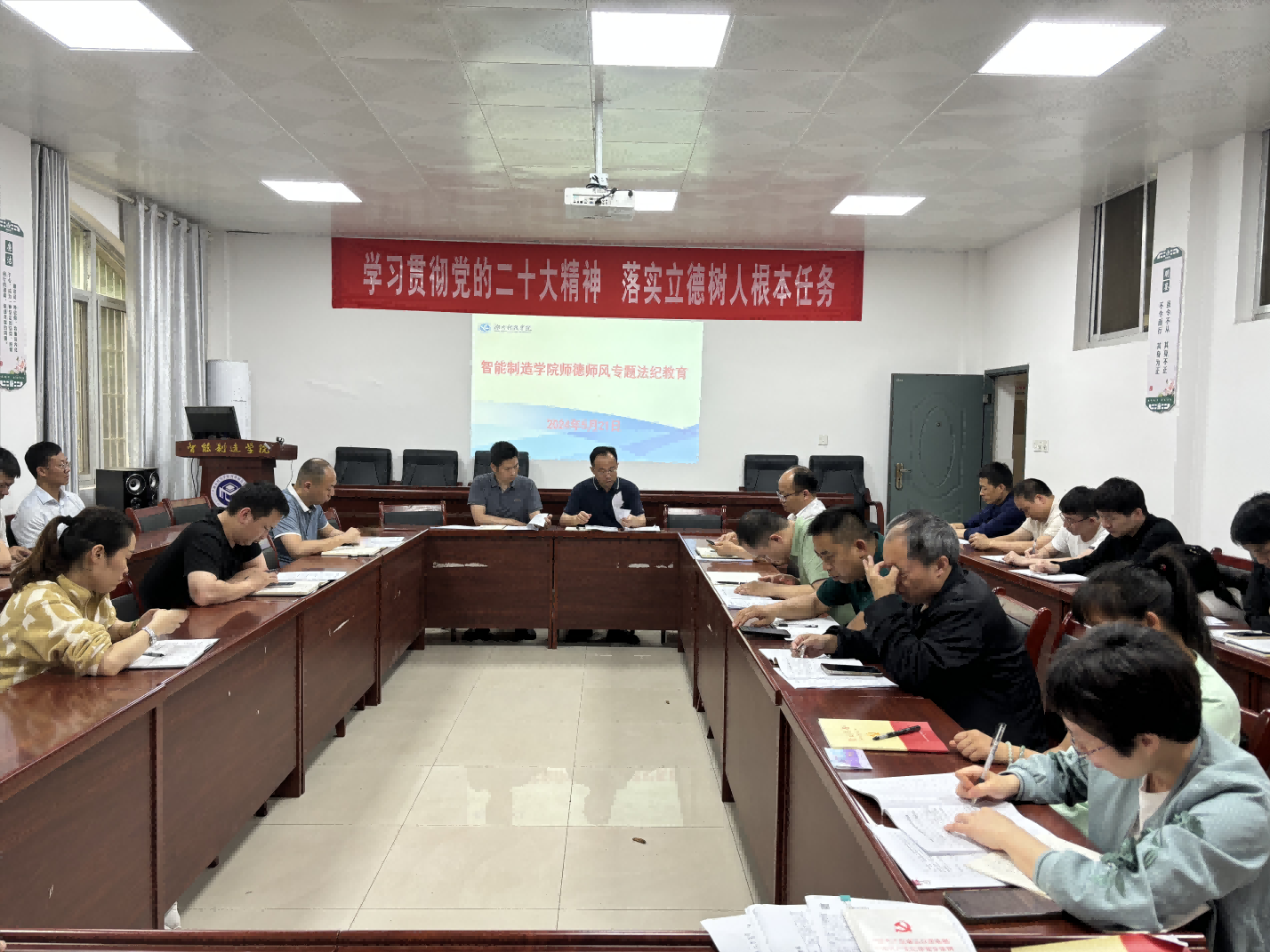 (通讯员 曾妙春)为进一步强化问题导向,突出规则立德,引导广大教师增强法纪意识,守教育初心,正师德师风,5月21日下午,学院在103会议室召开师德师风专题法纪教育会议,学院领导班子成员、全体教职工参加会议,会议由党总支书记杨攀主持。会上集中学习了《教师法》、《新时代高校教师职业行为十项准则》等相关内容,组织观看了《违反教师职业行为十项准则典型案例汇编(高校版)》,通报了近期出现的师德失范案例,与会人员围绕“严格日常教育管理” “坚守师德,廉洁从教”等开展学习研讨。