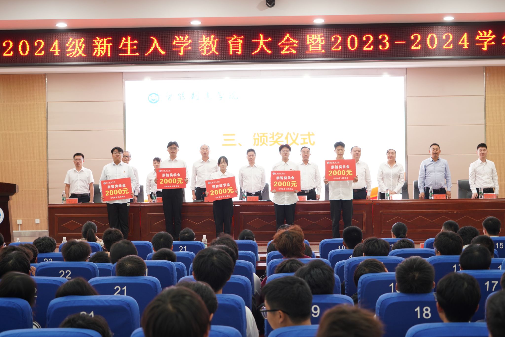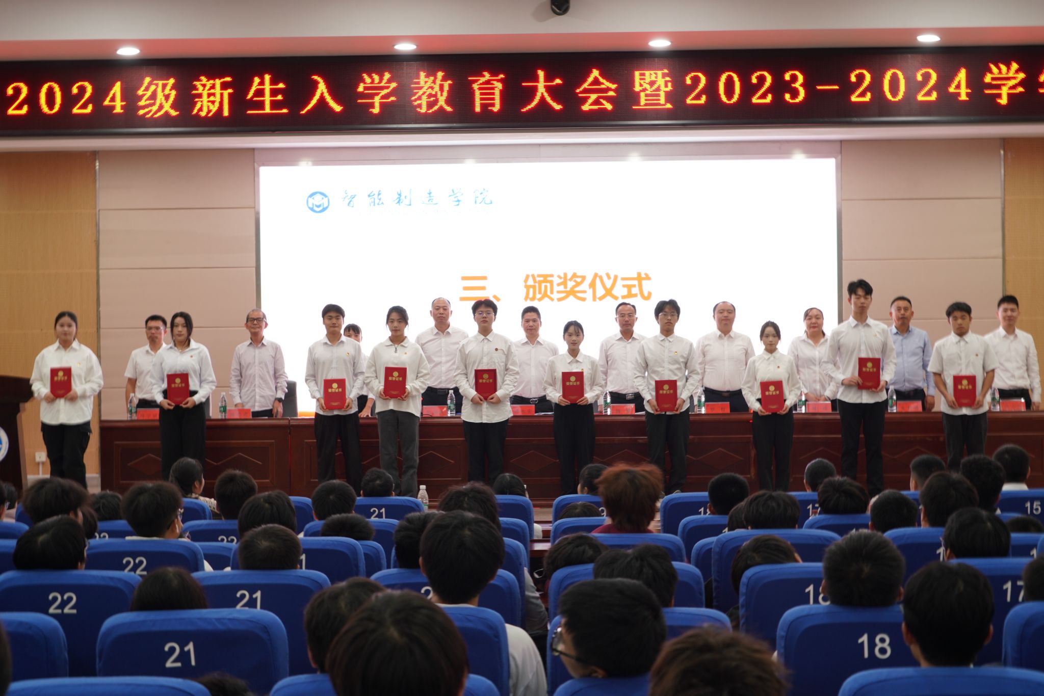 本网讯(通讯员 刘泽平)10月15日,学院在潇湘大讲堂举行2024级新生入学教育大会暨2023—2024学年学生颁奖典礼。学院领导、系主任、辅导员、2024级班主任、副班主任、受表彰对象和2024级全体新生参加会议,会议由彭涛凯主持。