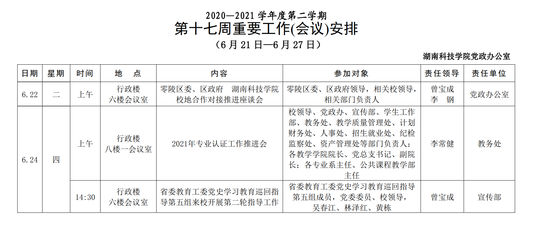 2020—2021学年度第二学期 第十七周重要工作(会议)安排