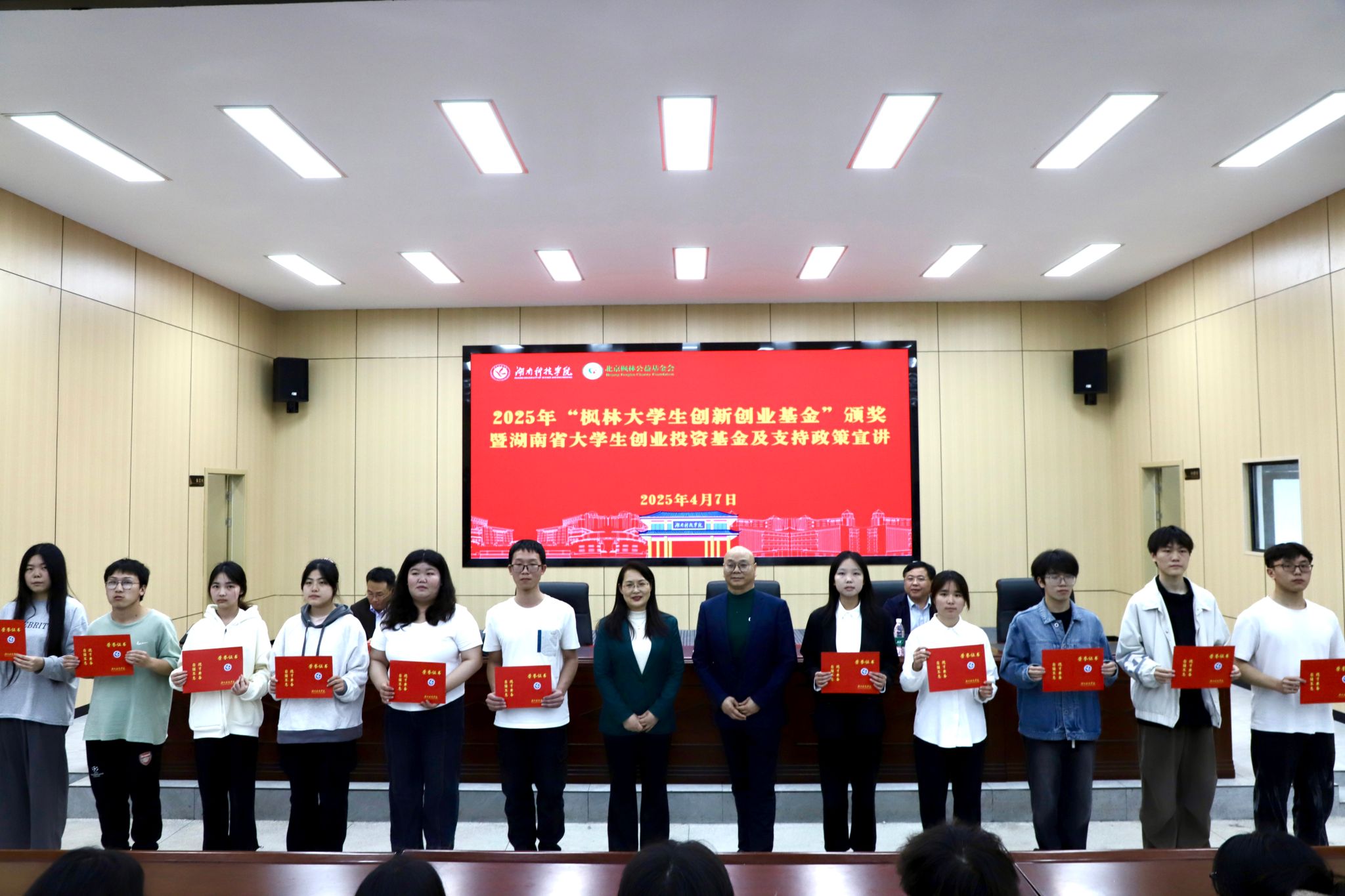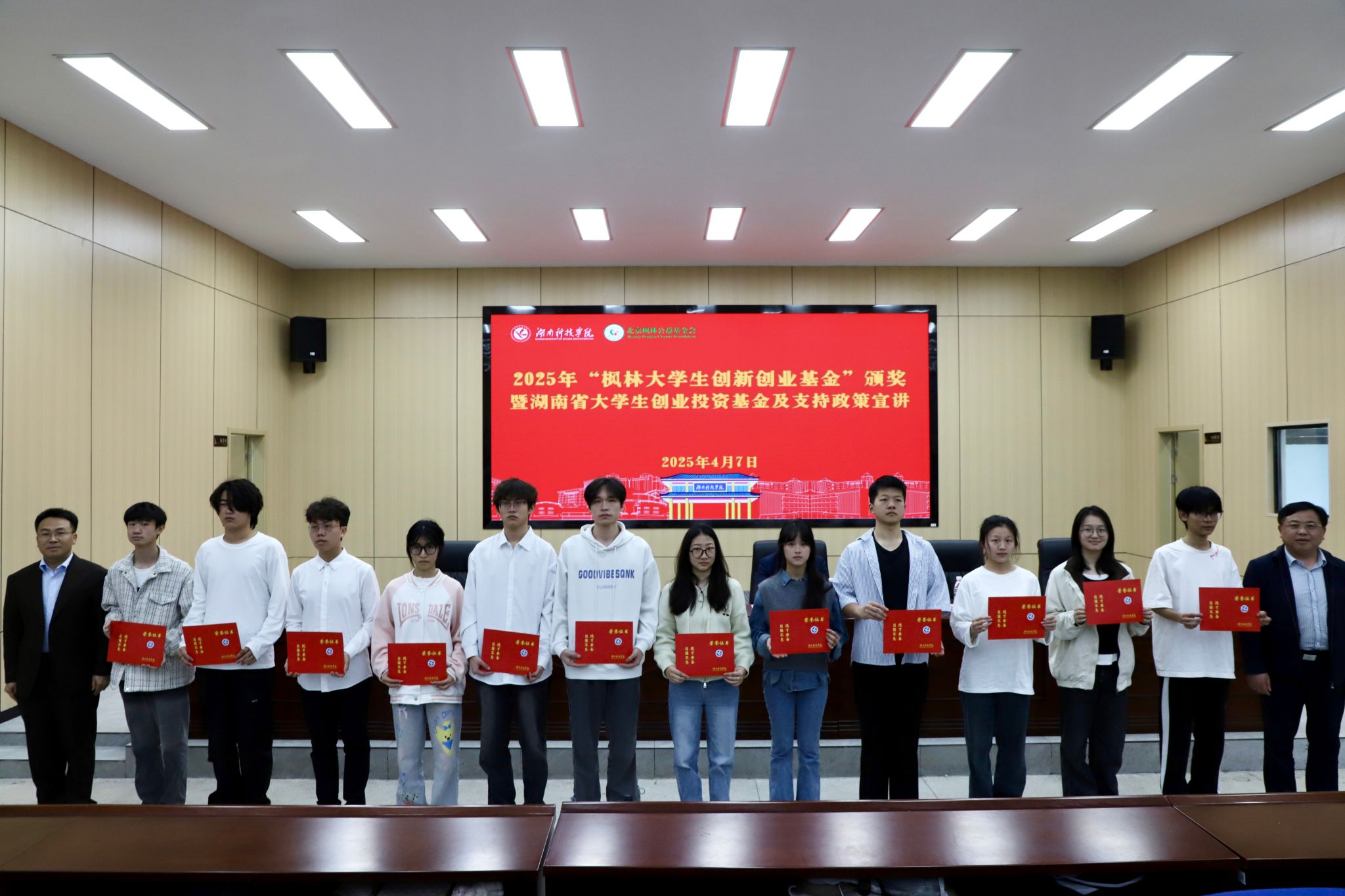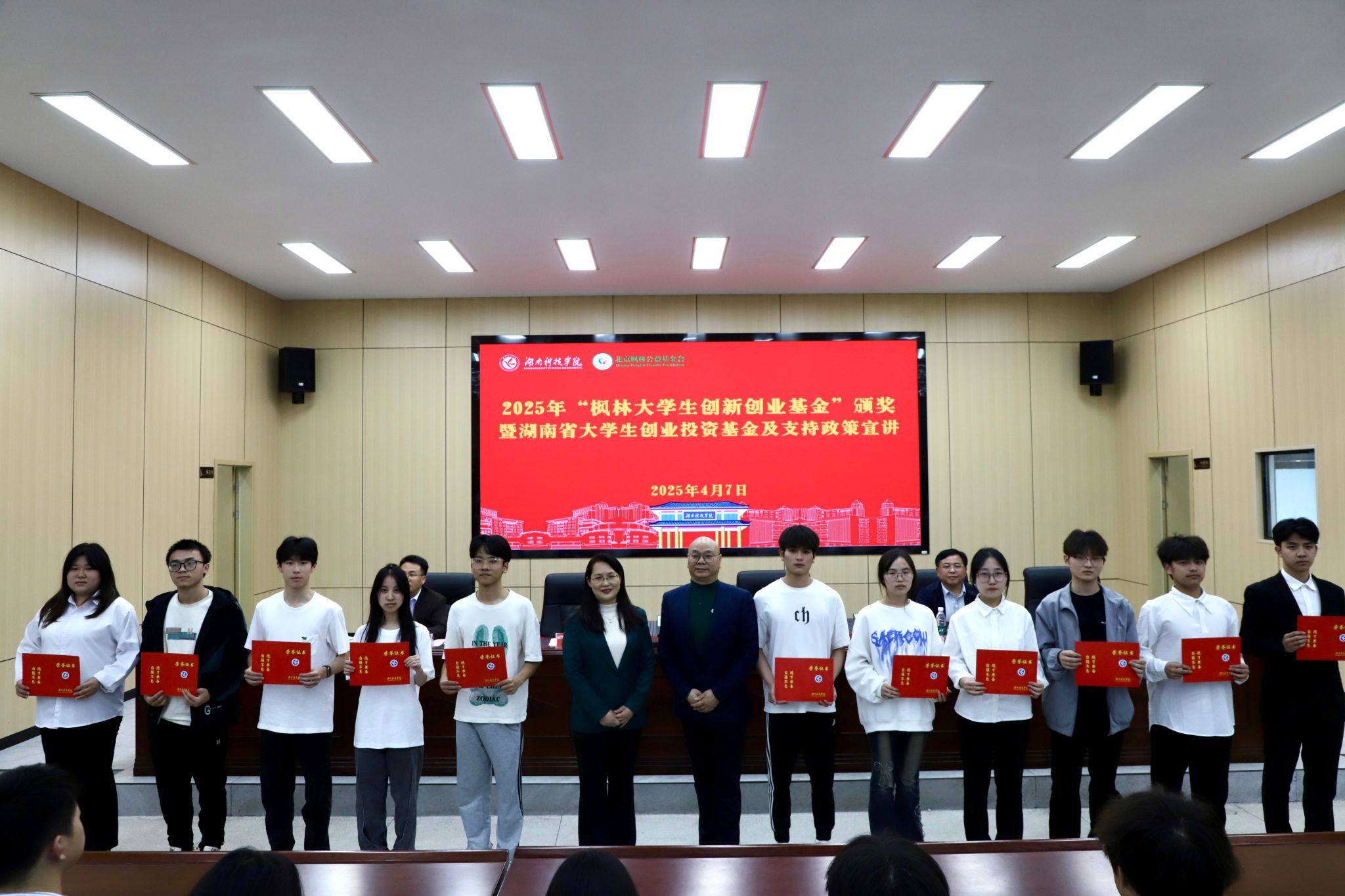 本网讯(记者 刘斌 唐晶 摄影 潘加)4月7日,2025年“枫林大学生创新创业基金”颁奖仪式暨湖南省大学生创业投资基金及支持政策宣讲活动在bat365官网举行。bat365官网77级校友、北京枫林公益基金会会长张亚红,副校长郑银芳出席活动,34个获基金资助的学生创业项目负责人、指导老师代表以及相关工作人员参加。